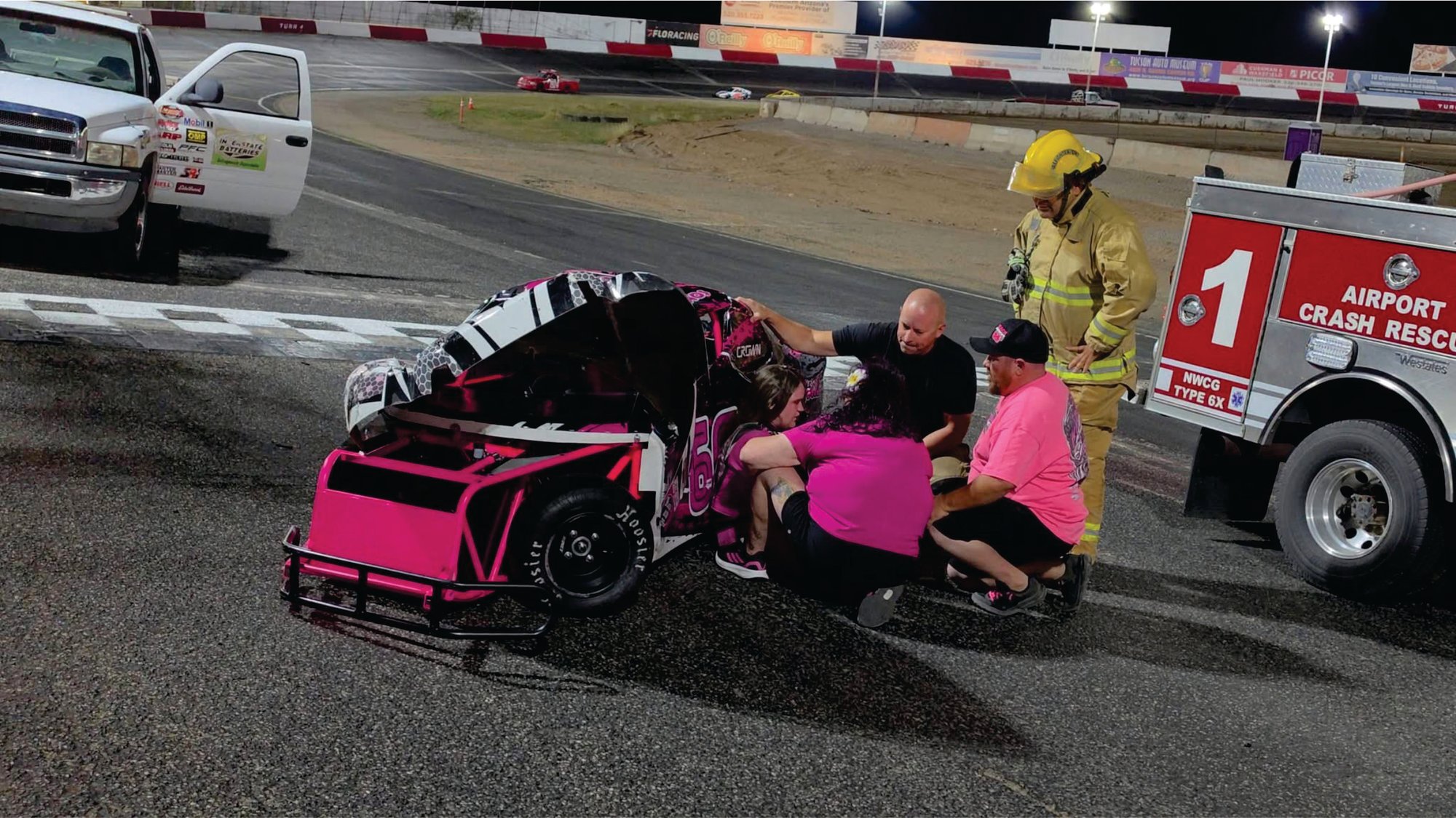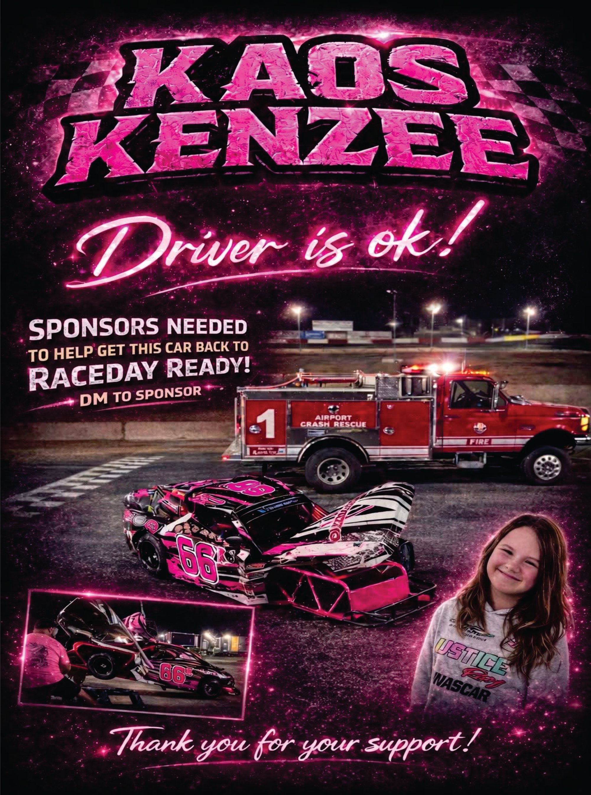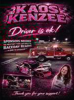 KAOS got up in the Wall at Tucson Speedway last weekend and she needs a little help getting the car back together, Shes Ok :)